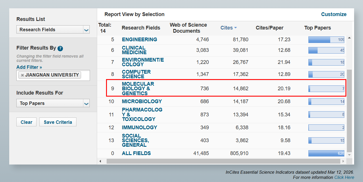 分子生物学与遗传学(MOLECULAR BIOLOGY & GENETICS)论文736篇,总被引次数14862次,首次进入ESI全球排名前1%,全球排名第1185位,学校学科建设又取得重要进展。